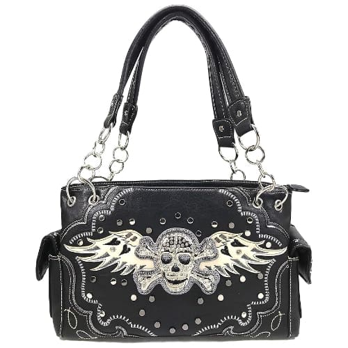 This striking shoulder bag features a unique Southwestern aesthetic with cow skull and feather motifs, providing a spacious interior and a dedicated, secure rear pocket for concealed carry.